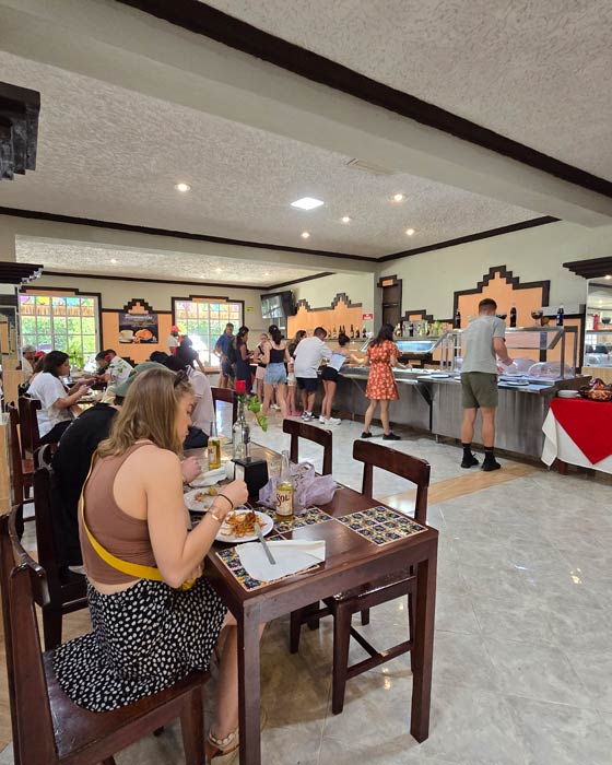 Nuestro comedor, completamente climatizado, está diseñado para que te sientas cómodo y relajado mientras disfrutas de tu comida. Las mesas de madera y el ambiente tranquilo crean el escenario perfecto para que te desconectes y saborees cada bocado. Además, te recomiendo probar nuestra amplia selección de bebidas naturales, refrescos embotellados y cervezas frías, que complementan a la perfección nuestros platillos.